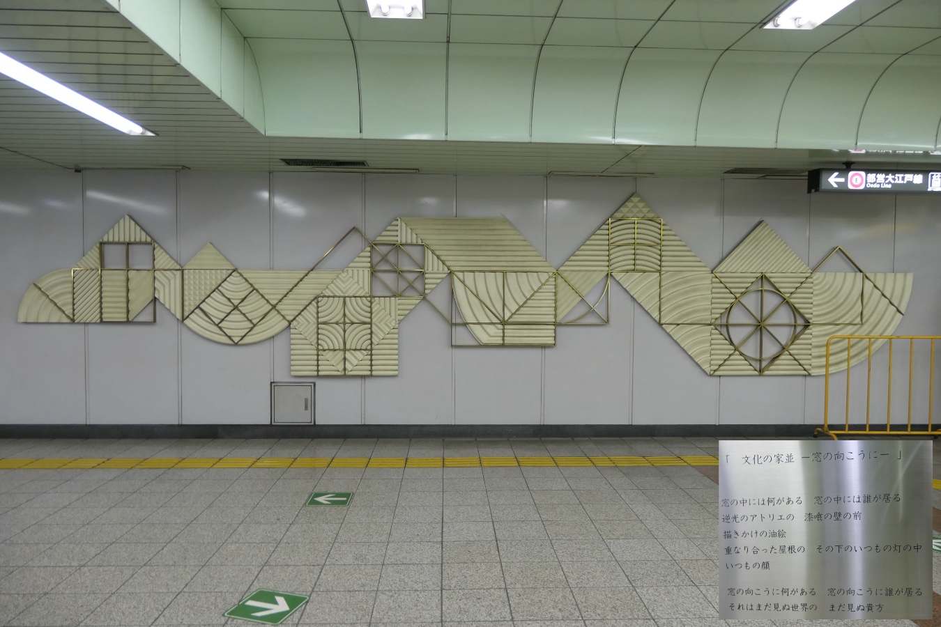 壁は薄緑の縦長プレートに駅名標周り2枚分が緑色。柱にも緑色が入っており、全体的に緑色でまとめられている。