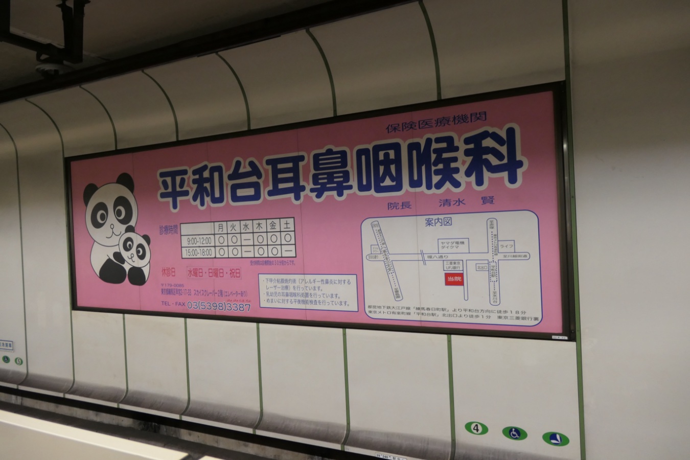 壁は白に緑色の縦線が入っている。大江戸線初期開業の4駅に共通する特徴として一般的な地下鉄の広告より大きい。
