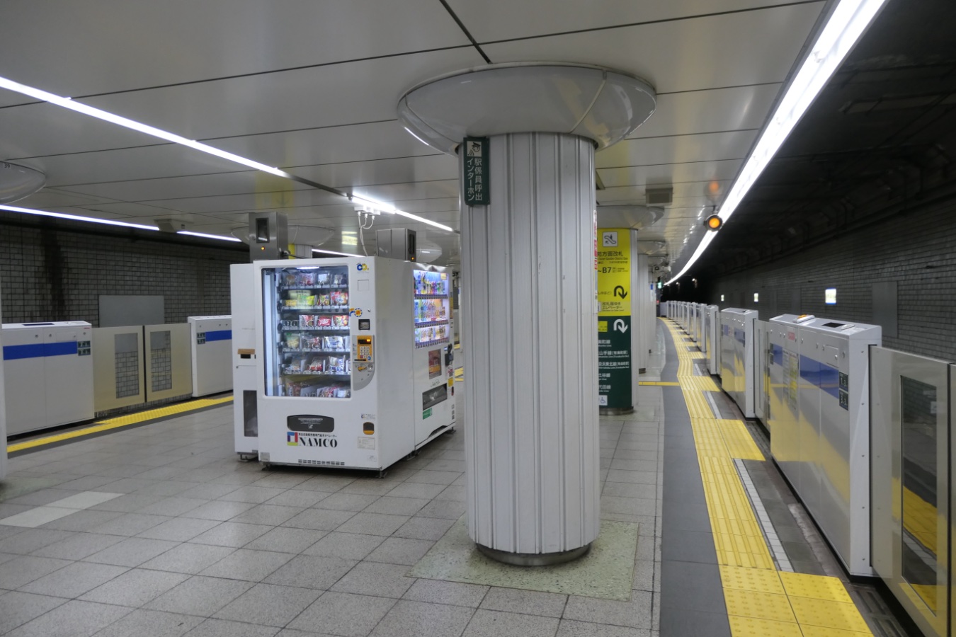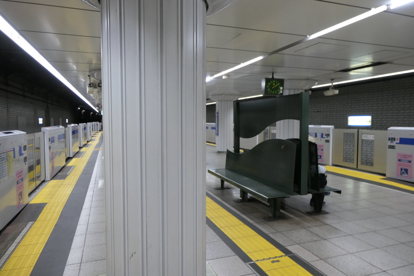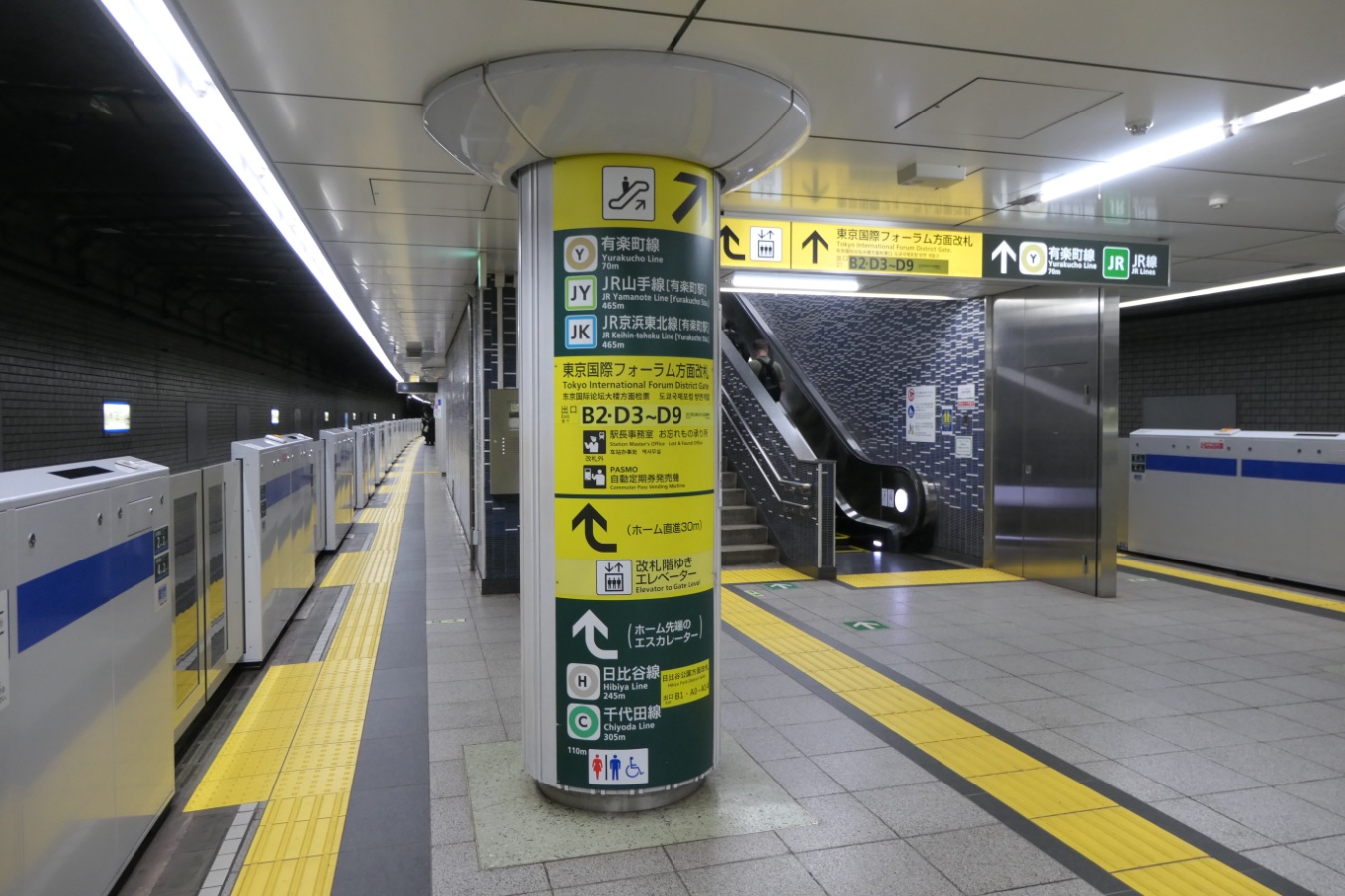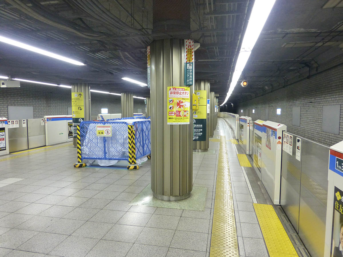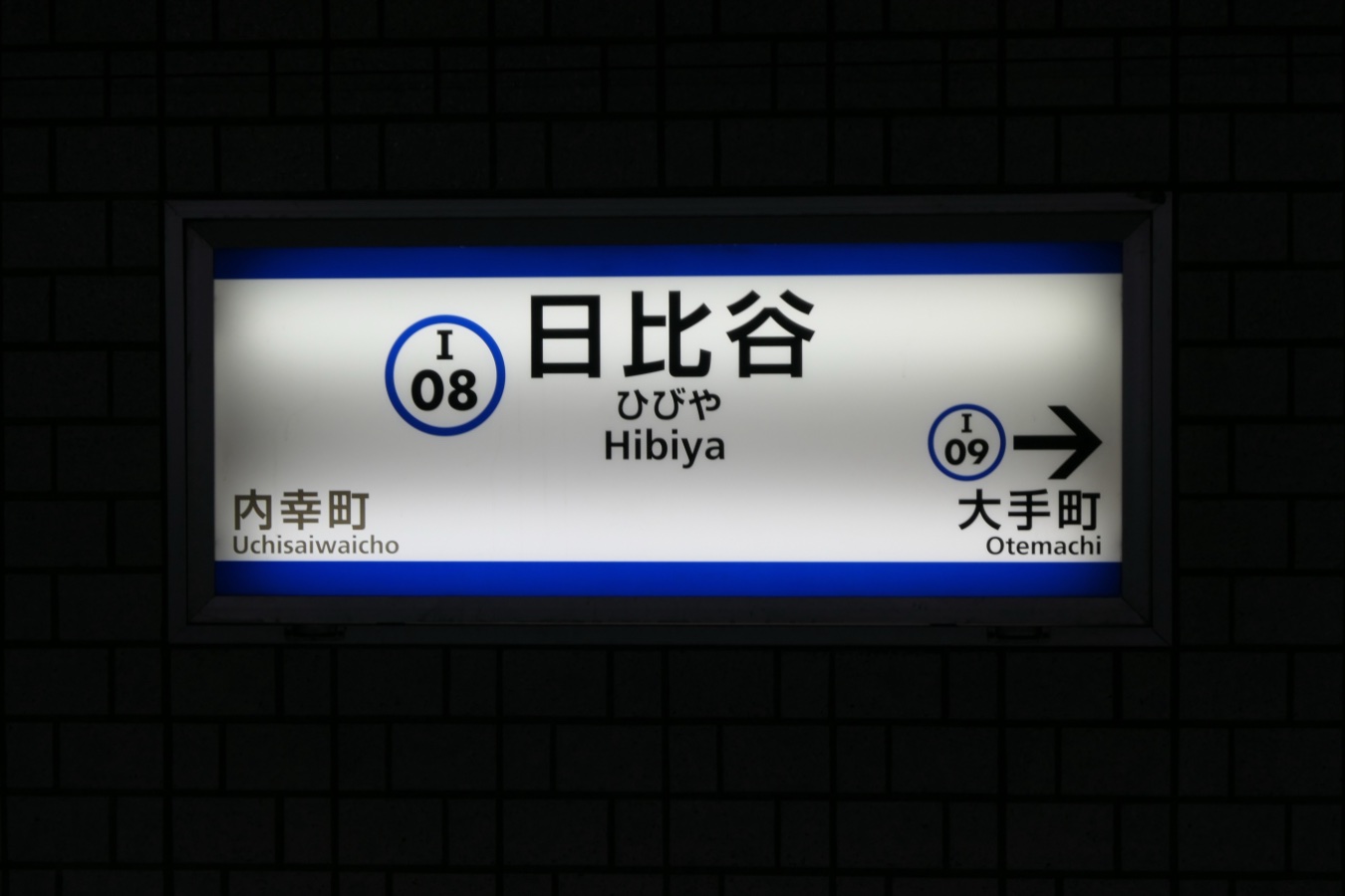 都営三田線 I08 都営三田線 日比谷駅 都営三田線 2015.02.022026.02.07 ひびや Hibiya ←I07 内幸町駅 ・ I09 大手町駅→ 乗り換え H08日比谷線 C09千代田線 Y18有楽町線(有楽町駅) JY30JR山手線(有楽町駅) JK25JR京浜東北線(有楽町駅) 構造 島式ホーム1面2線 NOTE 1972年6月開業。 壁は水色の濃淡のあるタイルを使用し、大きいタイルと小さいタイルの2つを1セットとして縦に交互に配置、全体で見れば通し目地のような変わったタイルパターンとなっている。神保町駅の壁とタイル配置は同じだが、こちらはツヤががないザラつきのあるタイルが使われている。 撮影日:2026年1月 撮影日:2018年4月