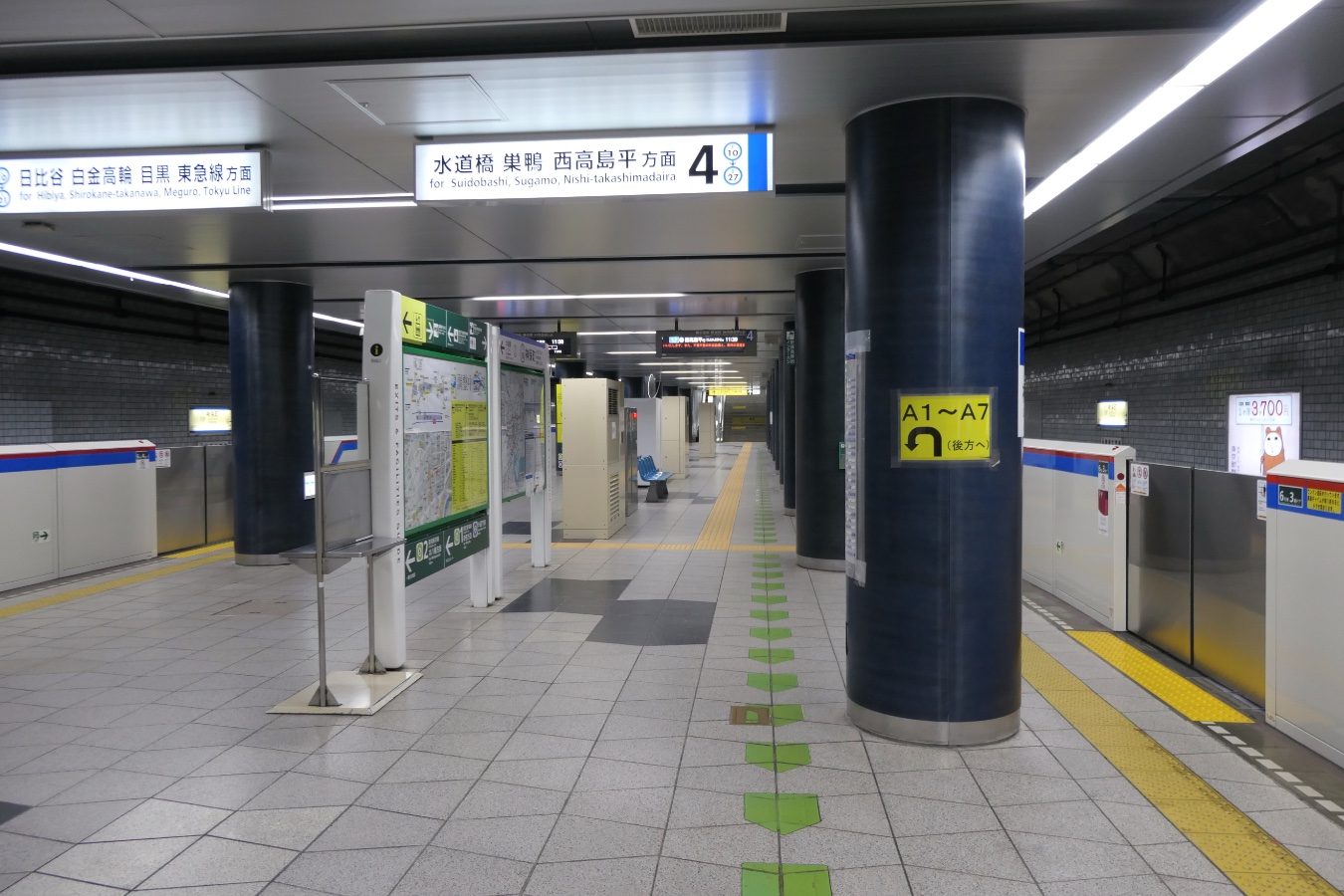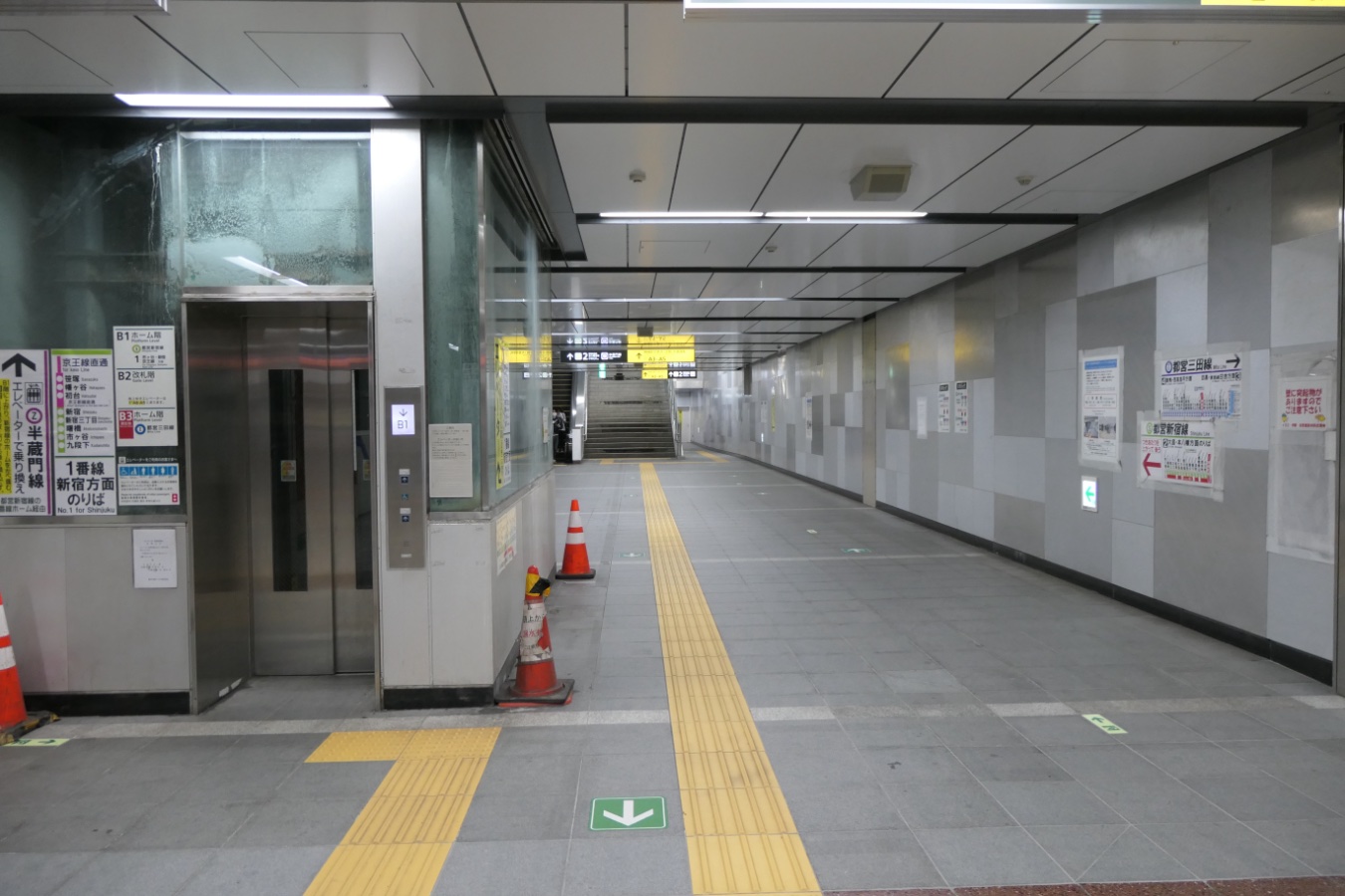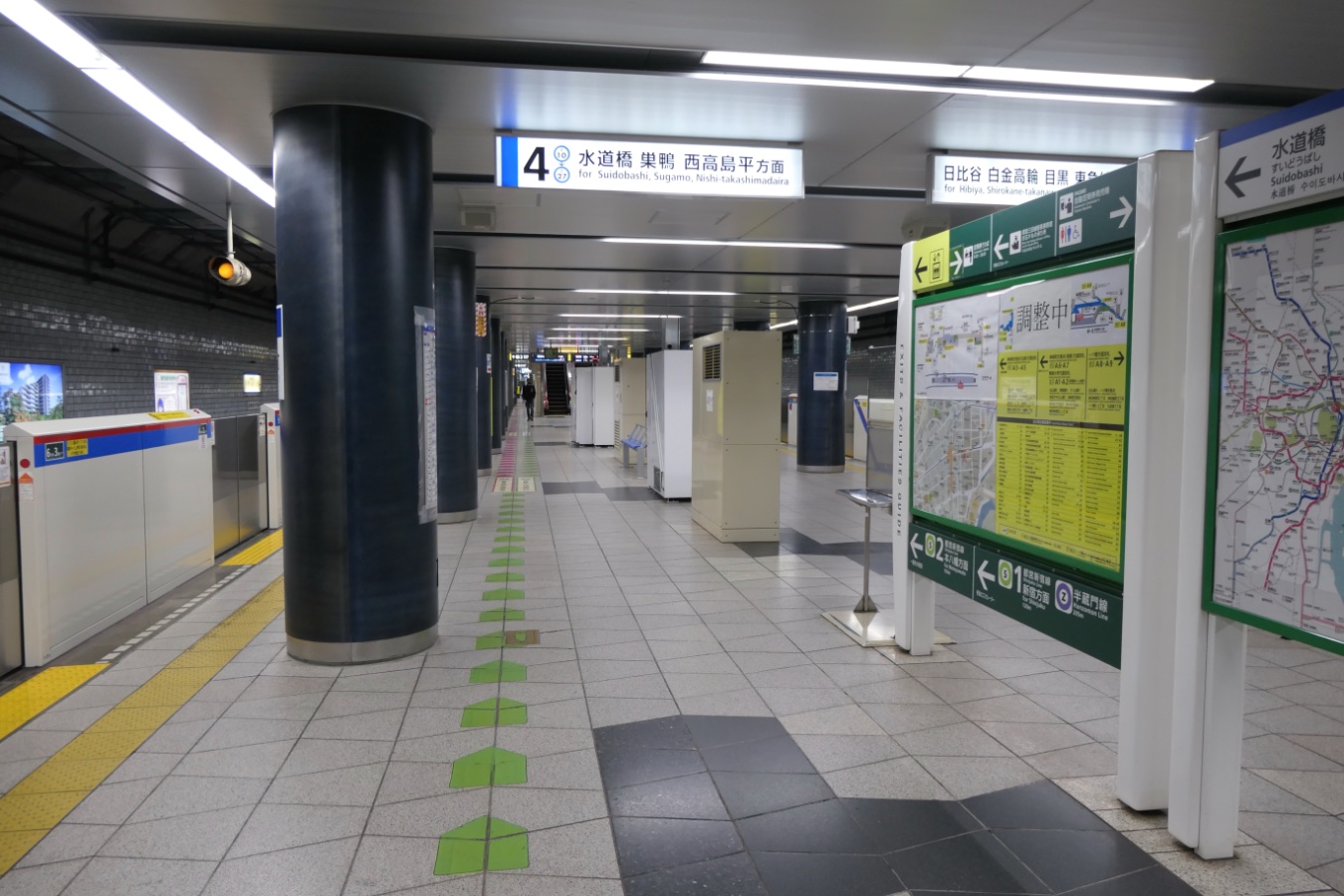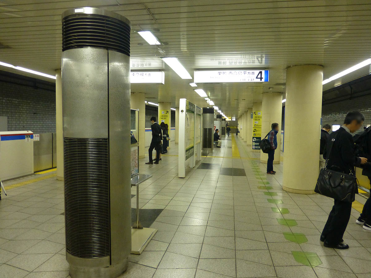 壁は水色の濃淡のあるタイルを使用し、大きいタイルと小さいタイルの2つを1セットとして縦に交互に配置、全体で見れば通し目地のような変わったタイルパターンとなっている。日比谷駅の壁とタイル配置は同じだが、こちらはツヤがあるタイルが使われている。