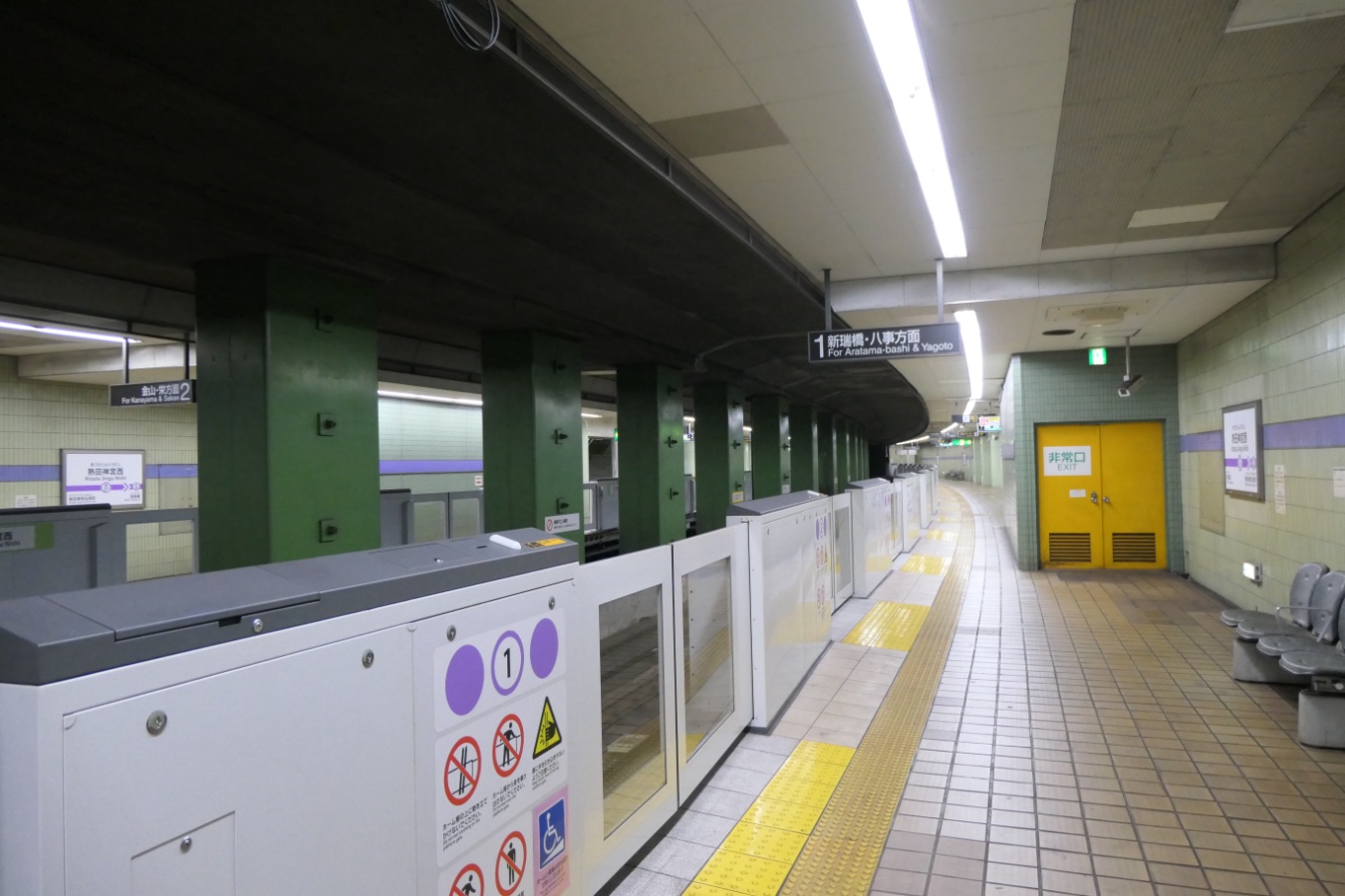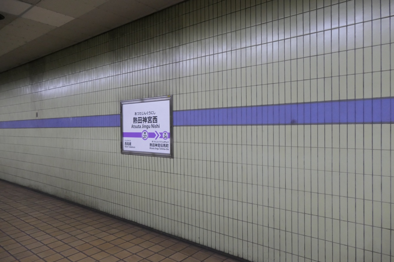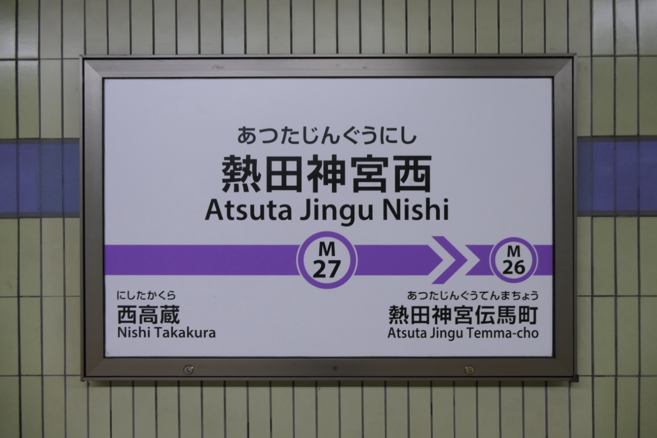 M27 名古屋市営地下鉄名城線 熱田神宮西駅 名城線 2016.04.022025.11.24 ←M26 熱田神宮伝馬町駅・M28 西高蔵駅→ 乗り換え なし 構造 相対式ホーム2面2線 NOTE 1974年3月神宮西駅として開業。2023年1月に現在の駅名に改称。 撮影日:2025年4月 撮影日:2021年11月