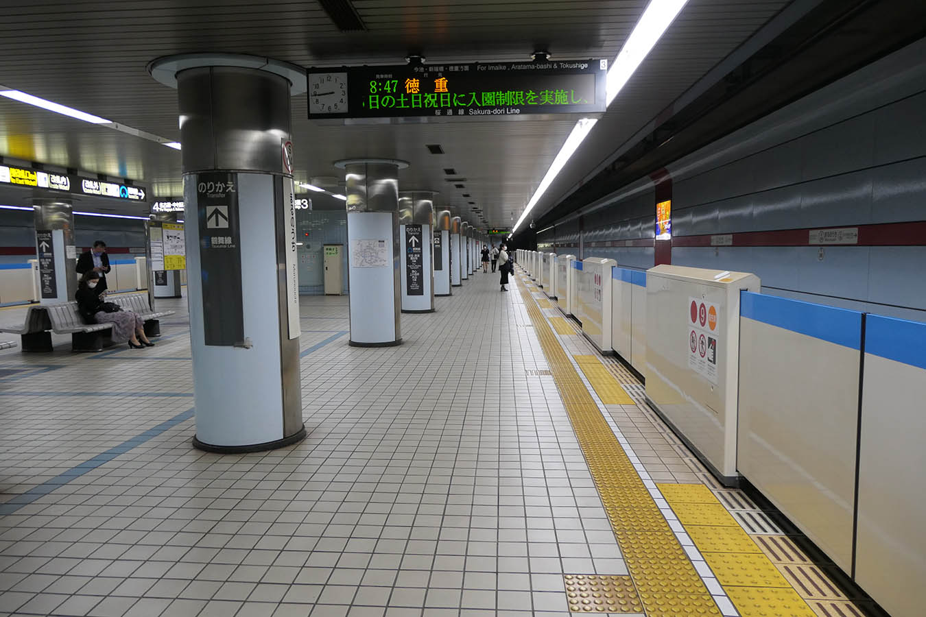 桜通線 S04 名古屋市営地下鉄桜通線 丸の内駅 桜通線 Twitter- LINE 2016.04.052025.12.20 まるのうち Marunouchi ←S03 国際センター駅 ・ S05 久屋大通駅→ 乗り換え T06名古屋市営地下鉄鶴舞線 構造 島式ホーム1面2線 NOTE 1989年9月開業。 撮影日:2021年11月