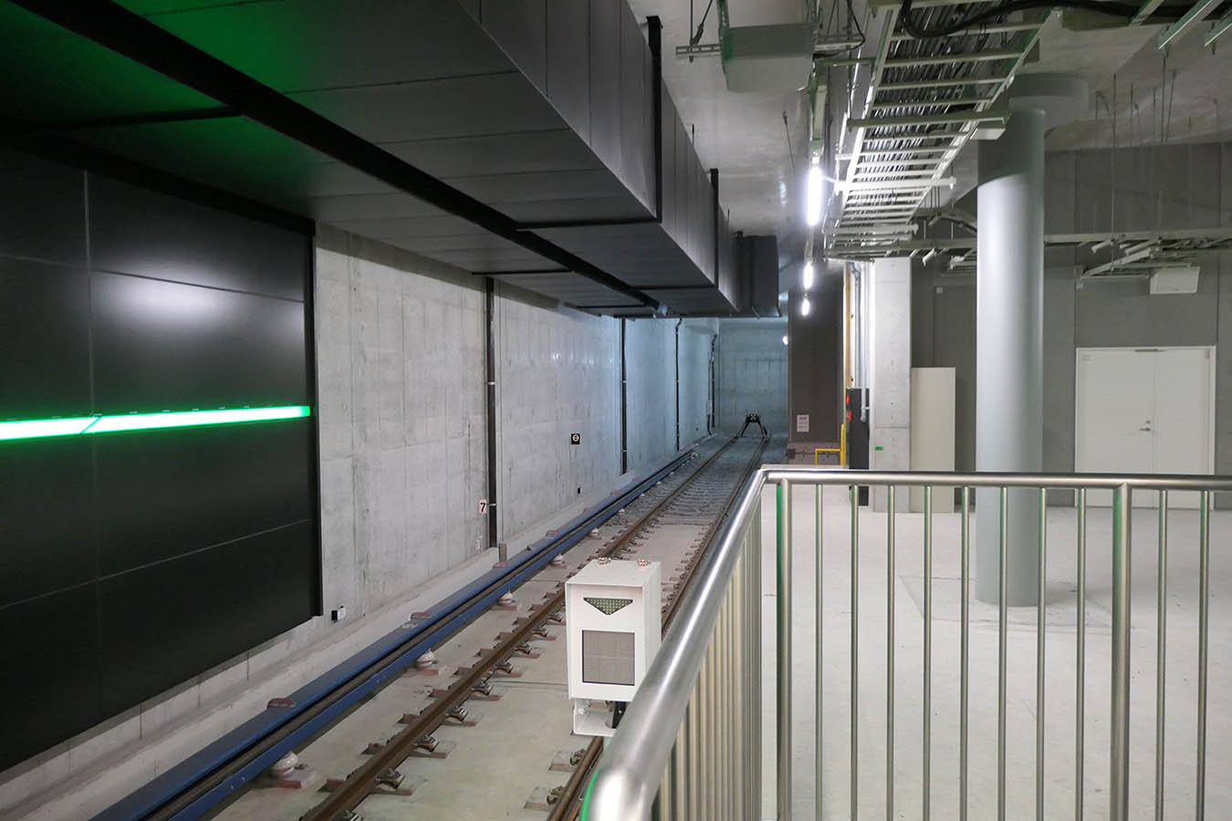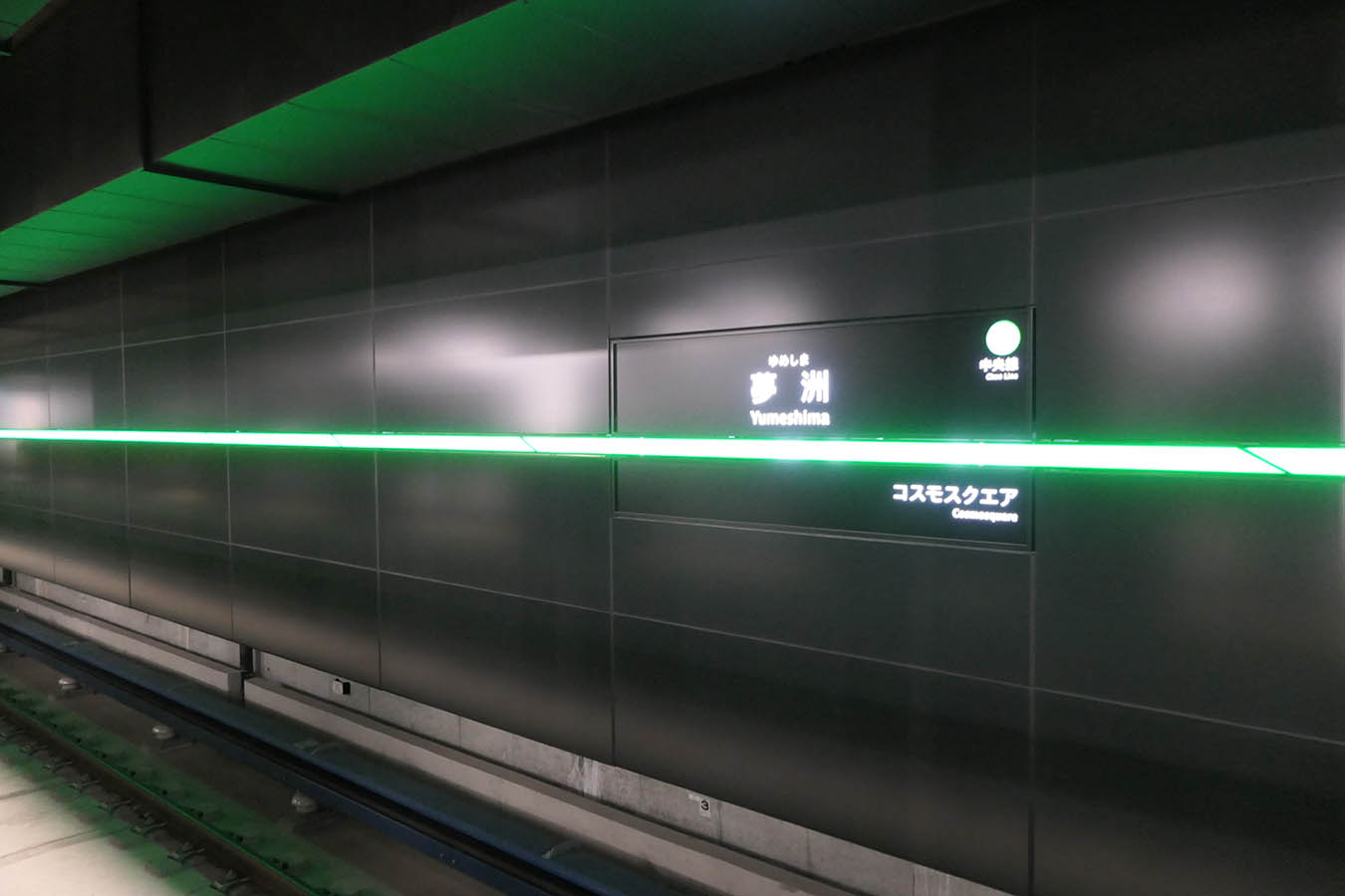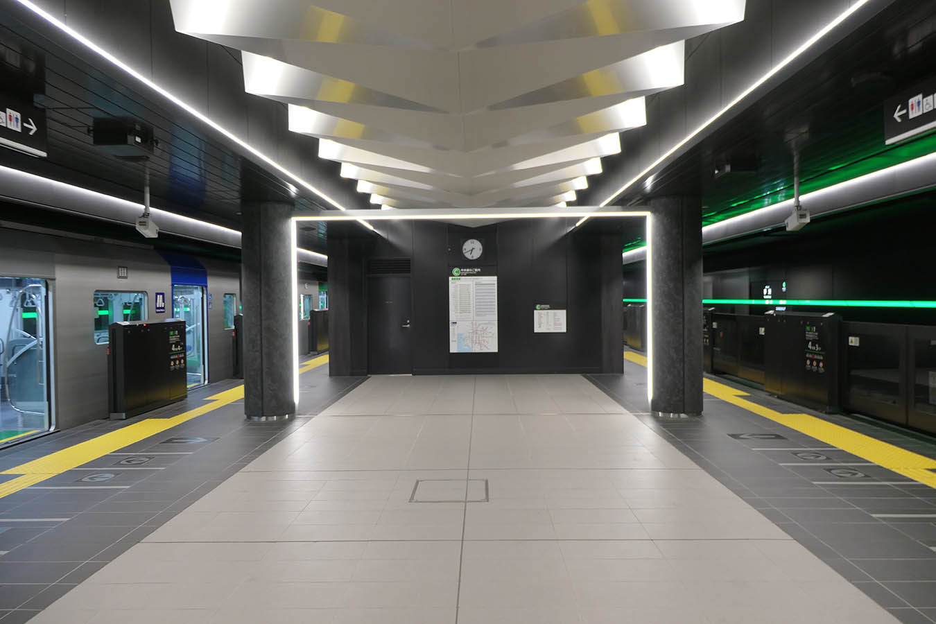 壁は黒のパネルに中央線のラインカラーである緑のライトが発光している。駅名標も一体となって貫いている。