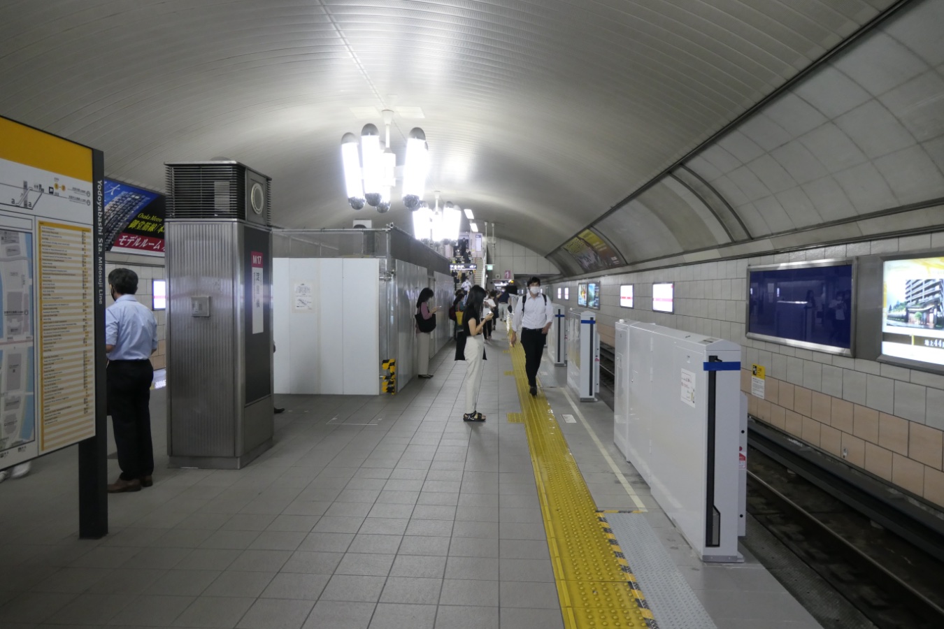 リニューアル前は大きい白のタイルで馬目地。下2列はオレンジ色になっていた。タイル壁の上にはズラッと大きい広告が並んでいた。