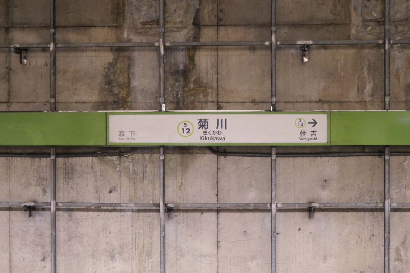 都営新宿線 S12 都営新宿線 菊川駅 都営新宿線 2015.02.032026.02.02 きくかわ Kikukawa ←S11 森下駅 ・ S13 住吉駅→ 乗り換え なし 構造 島式ホーム1面2線 NOTE 1978年12月開業。 撮影日:2026年1月 リニューアル前の壁 壁は水色の縦長プレートだった。 撮影日:2018年5月